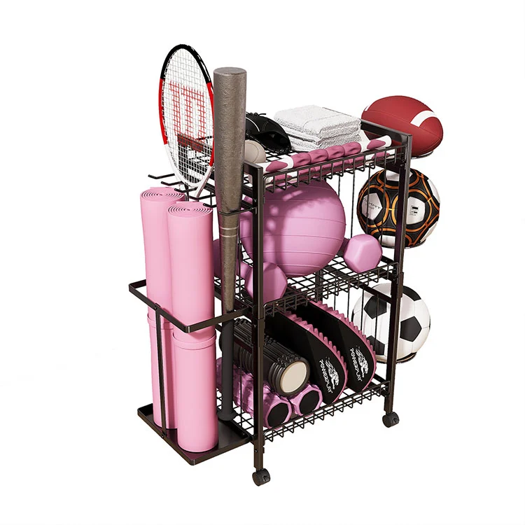 Овај подни метални сталак за јога простирку има три слоја плус два бочна система за складиштење. Лева страна је независно дизајнирана, проширујући простор, који може да држи 2-3 простирке за јогу нормалне величине када су постављене усправно. Усправно складиште такође може да прими опрему дугог типа као што су тениски рекети, бејзбол палице, хокејашки штапови, итд.